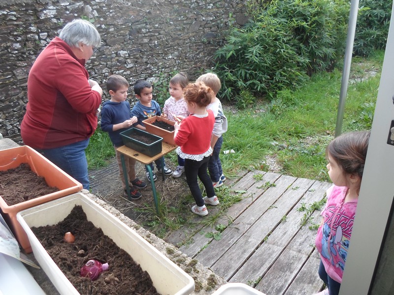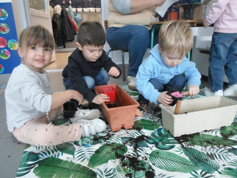 Cette semaine nous avons jardiné : semer des graines de Ray- Grass et planter des bulbes de tulipes, jacinthes et anémones.