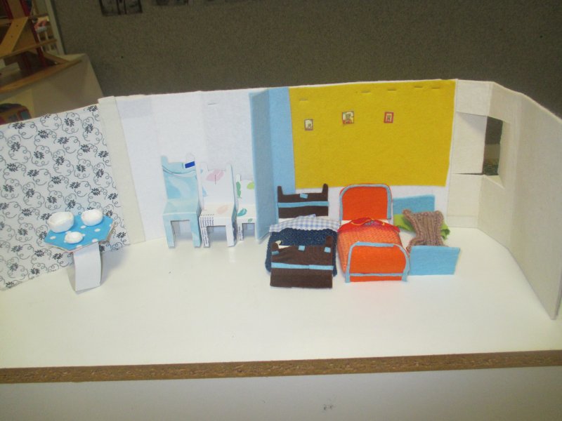 Depuis janvier nous étudions le conte de Boucle d’or. Evelyne,notre ASEM, nous a fabriqué les personnages et la maison du conte ; nous jouons beaucoup,beaucoup avec.